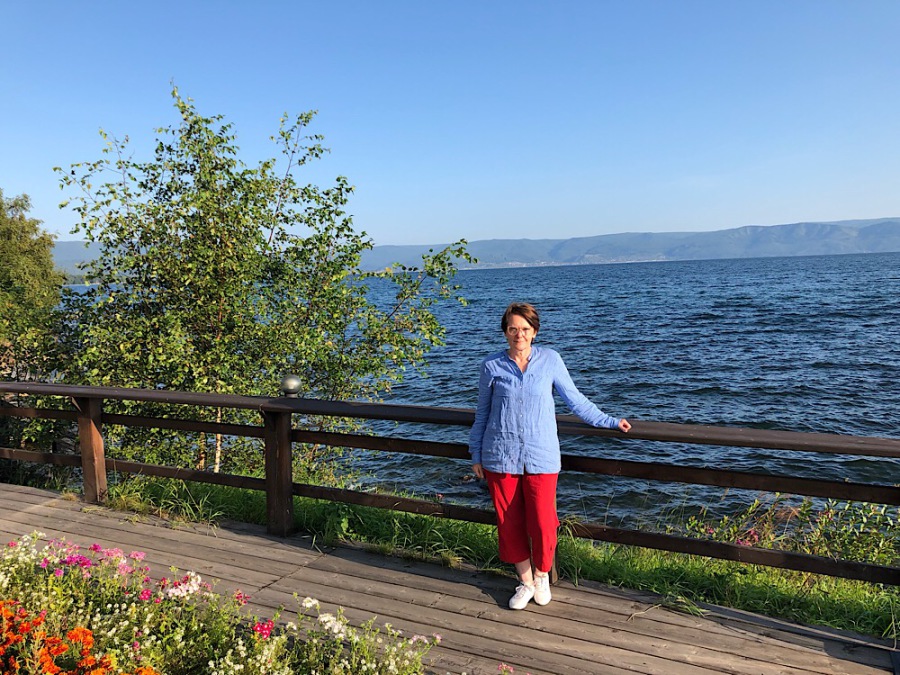 Kerstin hatte am Vortag mehrere Saunadurchgänge in der Banja mit anschließendem Bad im See. Nach einem guten Frühstück hat sie sich nun von ihrem Baikalsee verabschiedet.