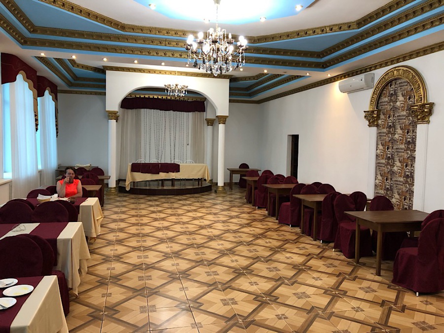 Frühstück wurde uns im Ballsaal des Hotels serviert. Ähnlich opulent war auch unser Zimmer ausgestattet: Sehr großzügig, alles in weißem, gesteppten Kunstleder, lilafarbene Store und Tagesdecken, vergoldete Putten usw..